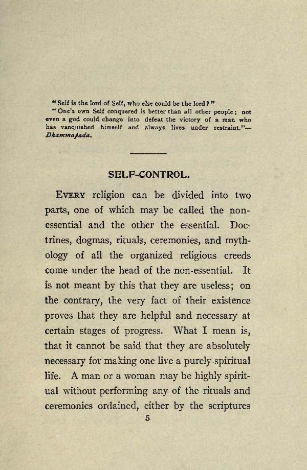 EVERY religion can be divided into two parts, one of which may be called the nonessential and the other the essential. Doctrines, dogmas, rituals, ceremonies, and mythology of all the organized religious creeds come under the head of the non-essential. It is not meant by this that they are useless; on the contrary, the very fact of their existence proves that they are helpful and necessary at certain stages of progress. What I mean is, that it cannot be said that they are absolutely necessary for making one live a purely spiritual life. A man or a woman may be highly spiritual without performing any of the rituals and ceremonies ordained, either by the scriptures