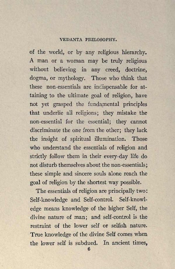 The essentials of religion are principally two: Self-knowledge and Self-control. Self-knowledge means knowledge of the higher Self, the divine nature of man; and self-control is the restraint of the lower self or selfish nature. True knowledge of the divine Self comes when the lower self is subdued. In ancient times,