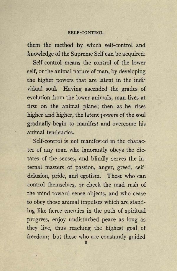 Self-control means the control of the lower self, or the animal nature of man, by developing the higher powers that are latent in the individual soul. Having ascended the grades of evolution from the lower animals, man lives at first on the animal plane; then as he rises higher and higher, the latent powers of the soul gradually begin to manifest and overcome his animal tendencies.