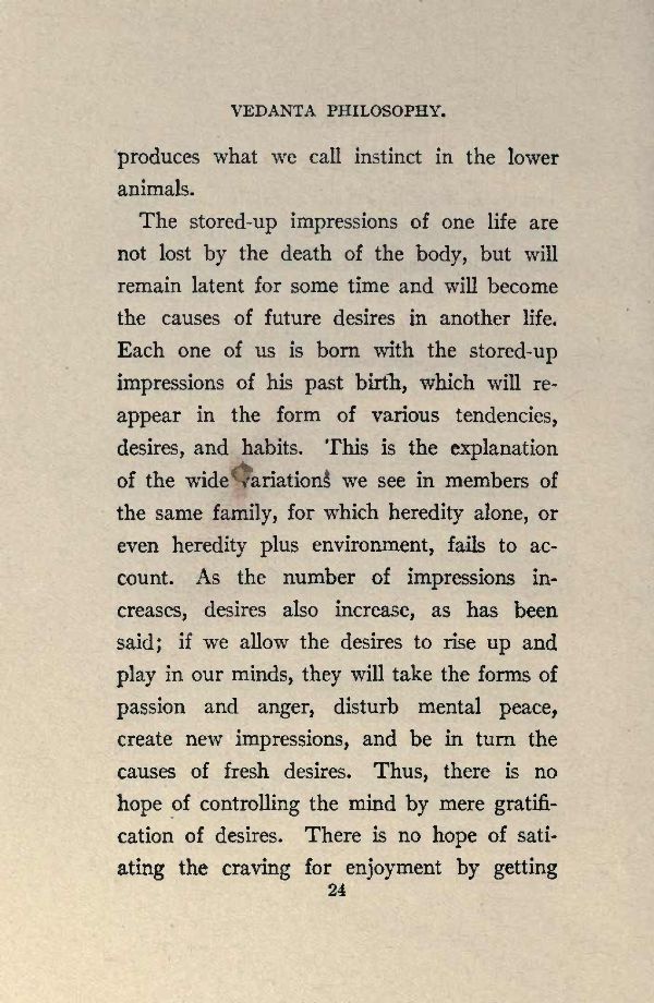 The stored-up impressions of one life are not lost by the death of the body, but will remain latent for some time and will become the causes of future desires in another life. Each one of us is born with the stored-up impressions of his past birth, which will reappear in the form of various tendencies, desires, and habits. This is the explanation of the wide variations we see in members of the same family, for which heredity alone, or even heredity plus environment, fails to account. As the number of impressions increases, desires also increase, as has been said; if we allow the desires to rise up and play in our minds, they will take the forms of passion and anger, disturb mental peace, create new impressions, and be in turn the causes of fresh desires. Thus, there is no hope of controlling the mind by mere gratification of desires. There is no hope of satiating the craving for enjoyment by getting