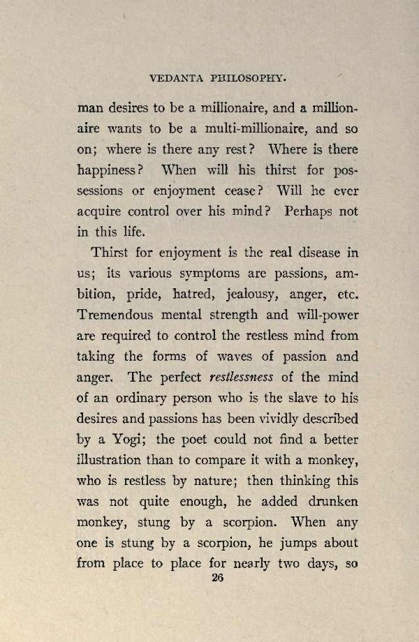 Thirst for enjoyment is the real disease in us; its various symptoms are passions, ambition, pride, hatred, jealousy, anger, etc. Tremendous mental strength and will-power are required to control the restless mind from taking the forms of waves of passion and anger. The perfect restlessness of the mind of an ordinary person who is the slave to his desires and passions has been vividly described by a Yogi; the poet could not find a better illustration than to compare it with a monkey, who is restless by nature; then thinking this was not quite enough, he added drunken monkey, stung by a scorpion. When any one is stung by a scorpion, he jumps about from place to place for nearly two days, so