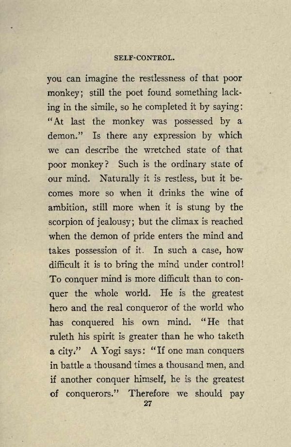 you can imagine the restlessness of that poor monkey; still the poet found something lacking in the simile, so he completed it by saying: "At last the monkey was possessed by a demon." Is there any expression by which we can describe the wretched state of that poor monkey? Such is the ordinary state of our mind. Naturally it is restless, but it becomes more so when it drinks the wine of ambition, still more when it is stung by the scorpion of jealousy; but the climax is reached when the demon of pride enters the mind and takes possession of it. In such a case, how difficult it is to bring the mind under control! To conquer mind is more difficult than to conquer the whole world. He is the greatest hero and the real conqueror of the world who has conquered his own mind. "He that ruleth his spirit is greater than he who taketh a city." A Yogi says: "If one man conquers in battle a thousand times a thousand men, and if another conquer himself, he is the greatest of conquerors."