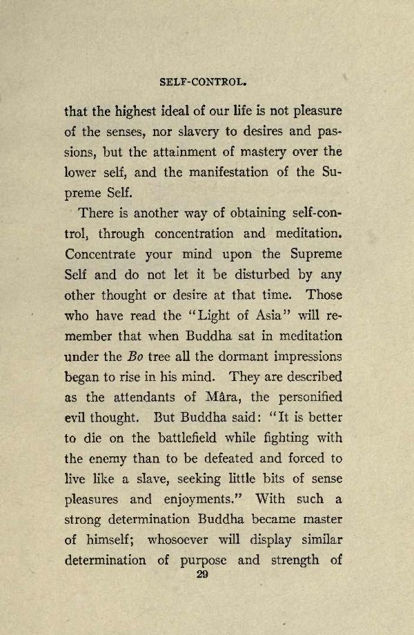 There is another way of obtaining self-control, through concentration and meditation. Concentrate your mind upon the Supreme Self and do not let it be disturbed by any other thought or desire at that time. Those who have read the "Light of Asia" will remember that when Buddha sat in meditation under the Bo tree all the dormant impressions began to rise in his mind. They are described as the attendants of Mara, the personified evil thought. But Buddha said: "It is better to die on the battlefield while fighting with the enemy than to be defeated and forced to live like a slave, seeking little bits of sense pleasures and enjoyments." With such a strong determination Buddha became master of himself; whosoever will display similar determination of purpose and strength of