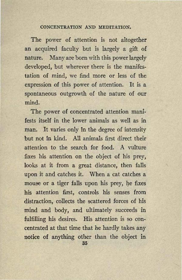 The power of concentrated attention manifests itself in the lower animals as well as in man. It varies only in the degree of intensity but not in kind. All animals first direct their attention to the search for food. A vulture fixes his attention on the object of his prey, looks at it from a great distance, then falls upon it and catches it. When a cat catches a mouse or a tiger falls upon his prey, he fixes his attention first, controls his senses from distraction, collects the scattered forces of his mind and body, and ultimately succeeds in fulfilling his desires. His attention is so concentrated at that time that he hardly takes any notice of anything other than the object in