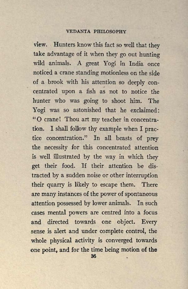 view. Hunters know this fact so well that they take advantage of it when they go out hunting wild animals. A great Yogi in India once noticed a crane standing motionless on the side of a brook with his attention so deeply concentrated upon a fish as not to notice the hunter who was going to shoot him. The Yogi was so astonished that he exclaimed: "0 crane! Thou art my teacher in concentration. I shall follow thy example when I practice concentration." In all beasts of prey the necessity for this concentrated attention is well illustrated by the way in which they get their food. If their attention be distracted by a sudden noise or other interruption their quarry is likely to escape them. There are many instances of the power of spontaneous attention possessed by lower animals. In such cases mental powers are centred into a focus and directed towards one object. Every sense is alert and under complete control, the whole physical activity is converged towards one point, and for the time being motion of the