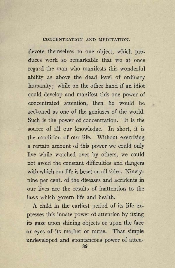 devote themselves to one object, which produces work so remarkable that we at once regard the man who manifests this wonderful ability as above the dead level of ordinary humanity; while on the other hand if an idiot could develop and manifest this one power of concentrated attention, then he would be reckoned as one of the geniuses of the world. Such is the power of concentration. It is the source of all our knowledge. In short, it is the condition of our life. Without exercising a certain amount of this power we could only live while watched over by others, we could not avoid the constant difficulties and dangers with which our life is beset on all sides. Ninety-nine per cent. of the diseases and accidents in our lives are the results of inattention to the laws which govern life and health.