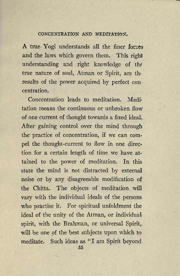 Concentration leads to meditation. Meditation means the continuous or unbroken flow of one current of thought towards a fixed ideal. After gaining control over the mind through the practice of concentration, if we can compel the thought-current to flow in one direction for a certain length of time we have attained to the power of meditation. In this state the mind is not distracted by external noise or by any disagreeable modification of the Chitta. The objects of meditation will vary with the individual ideals of the persons who practise it. For spiritual unfoldment the ideal of the unity of the Atman, or individual spirit, with the Brahman, or universal Spirit, will be one of the best subjects upon which to meditate. Such ideas as "I am Spirit beyond