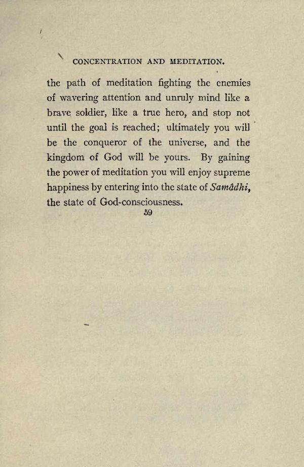 the path of meditation fighting the enemies of wavering attention and unruly mind like a brave soldier, like a true hero, and stop not until the goal is reached; ultimately you will be the conqueror of the universe, and the kingdom of God will be yours. By gaining the power of meditation you will enjoy supreme happiness by entering into the state of Samadhi, the state of God-consciousness.