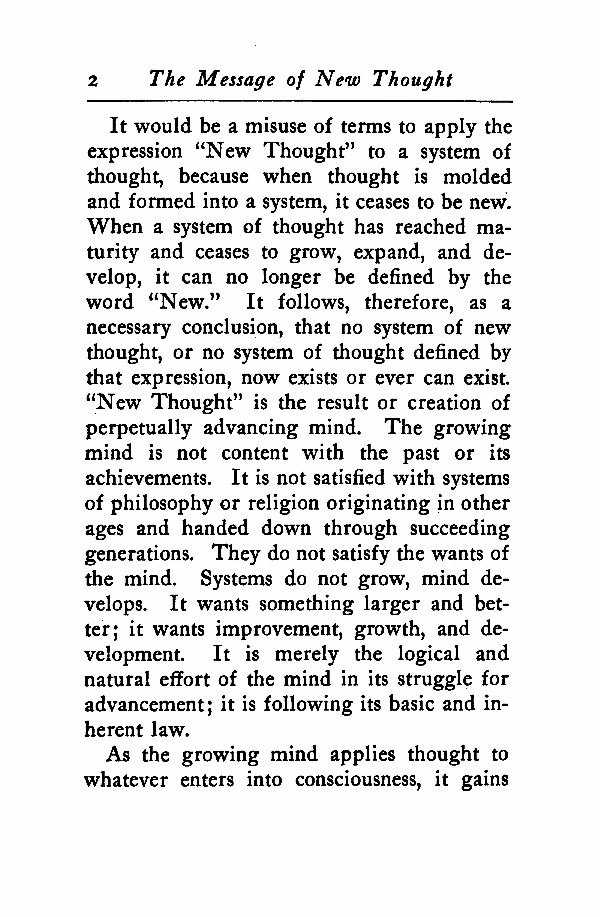 It would be a misuse of terms to apply the expression "New Thought" to a system of thought, because when thought is molded and formed into a system, it ceases to be new. When a system of thought has reached maturity and ceases to grow, expand, and develop, it can no longer be defined by the word "New." It follows, therefore, as a necessary conclusion, that no system of new thought, or no system of thought defined by that expression, now exists or ever can exist. "New Thought" is the result or creation of perpetually advancing mind. The growing mind is not content with the past or its achievements. It is not satisfied with systems of philosophy or religion originating in other ages and handed down through succeeding generations. They do not satisfy the wants of the mind. Systems do not grow, mind develops. It wants something larger and better; it wants improvement, growth, and development. It is merely the logical and natural effort of the mind in its struggle for advancement; it is following its basic and inherent law.