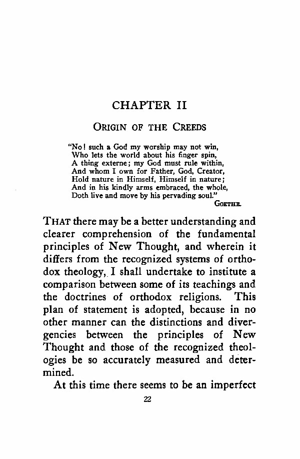 principles of New Thought, and wherein it differs from the recognized systems of orthodox theology, I shall undertake to institute a comparison between some of its teachings and the doctrines of orthodox religions. This plan of statement is adopted, because in no other manner can the distinctions and divergencies between the principles of New Thought and those of the recognized theologies be so accurately measured and determined.