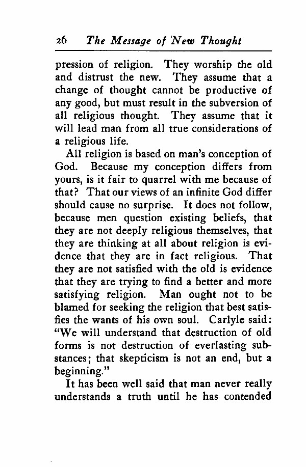 All religion is based on man's conception of God. Because my conception differs from yours, is it fair to quarrel with me because of that? That our views of an infinite God differ should cause no surprise. It does not follow, because men question existing beliefs, that they are not deeply religious themselves, that they are thinking at all about religion is evidence that they are in fact religious. That they are not satisfied with the old is evidence that they are trying to find a better and more satisfying religion. Man ought not to be blamed for seeking the religion that best satisfies the wants of his own soul. Carlyle said: "We will understand that destruction of old forms is not destruction of everlasting substances; that skepticism is not an end, but a beginning."