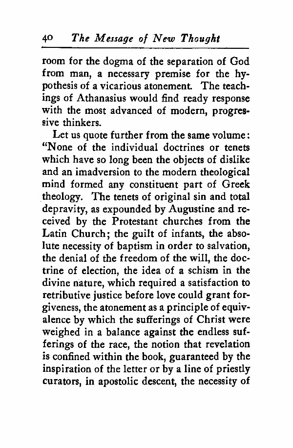 room for the dogma of the separation of God from man, a necessary premise for the hypothesis of a vicarious atonement. The teachings of Athanasius would find ready response with the most advanced of modern, progressive thinkers.