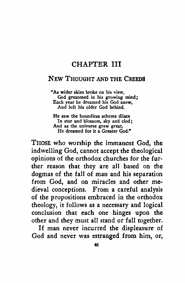 THOSE who worship the immanent God, the indwelling God, cannot accept the theological opinions of the orthodox churches for the further reason that they are all based on the dogmas of the fall of man and his separation from God, and on miracles and other medieval conceptions. From a careful analysis of the propositions embraced in the orthodox theology, it follows as a necessary and logical conclusion that each one hinges upon the other and they must all stand or fall together.