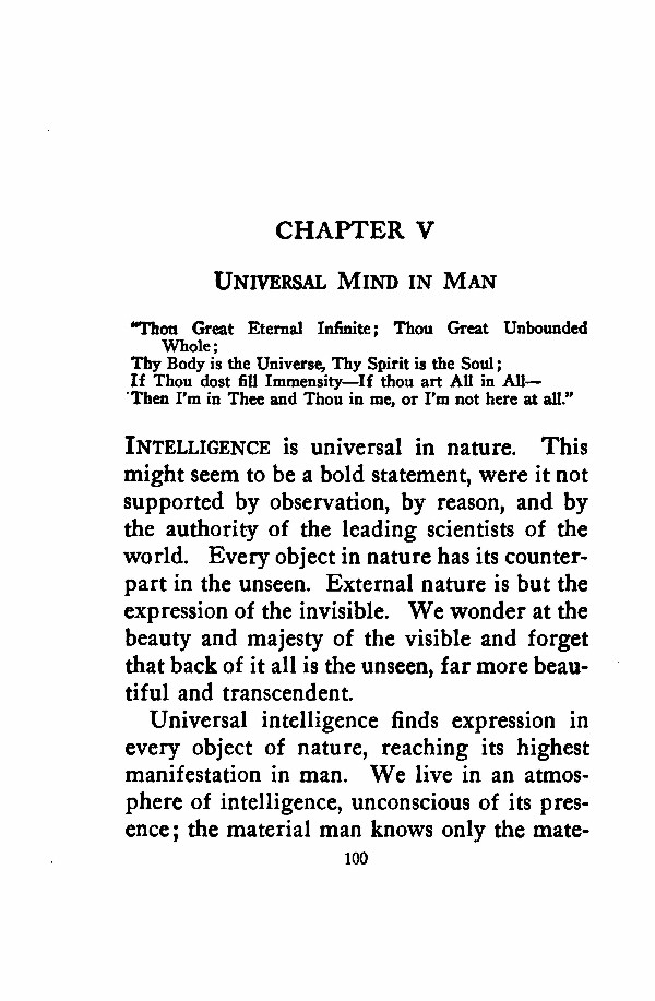 INTELLIGENCE is universal in Nature. This might seem to be a bold statement, were it not supported by observation, by reason, and by the authority of the leading scientists of the world. Every object in Nature has its counterpart in the unseen. External Nature is but the expression of the invisible. We wonder at the beauty and majesty of the visible and forget that back of it all is the unseen, far more beautiful and transcendent.