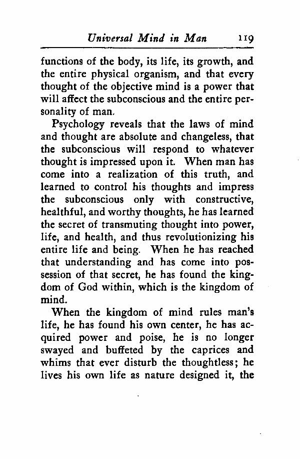 Psychology reveals that the laws of mind and thought are absolute and changeless, that the subconscious will respond to whatever thought is impressed upon it. When man has come into a realization of this truth. and learned to control his thoughts and impress the subconscious only with constructive, healthful, and worthy thoughts, he has learned the secret of transmuting thought into power, life, and health, and thus revolutionizing his entire life and being. When he has reached that understanding and has come into possession of that secret, he has found the kingdom of God within, which is the kingdom of mind.