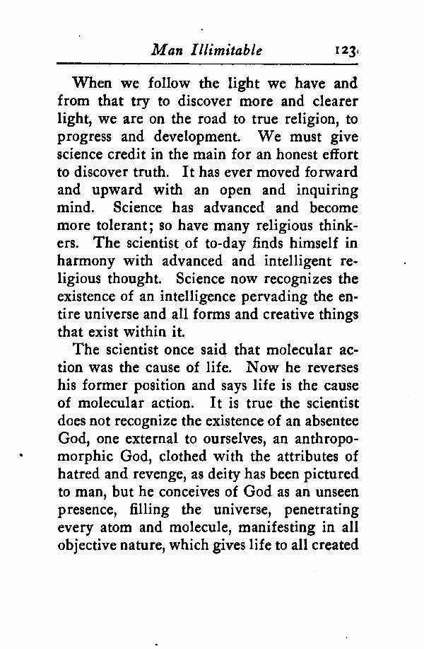 The scientist once said that molecular action was the cause of life. Now he reverses his former position and says life is the cause of molecular action. It is true the scientist does not recognize the existence of an absentee God, one external to ourselves, an anthropomorphic God, clothed with the attributes of hatred and revenge, as deity has been pictured to man, but he conceives of God as an unseen presence, filling the universe, penetrating every atom and molecule, manifesting in all objective Nature, which gives life to all created
