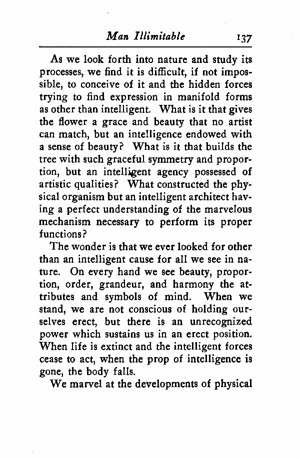 The wonder is that we ever looked for other than an intelligent cause for all we see in Nature. On every hand we see beauty, proportion, order, grandeur, and harmony, the attributes and symbols of mind. When we stand, we are not conscious of holding ourselves erect, but there is an unrecognized power which sustains us in an erect position. When life is extinct and the intelligent forces cease to act, when the prop of intelligence is gone, the body falls.