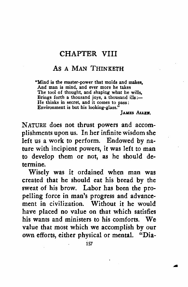 NATURE does not thrust powers and accomplishments upon us. In her infinite wisdom she left us a work to perform. Endowed by Nature with incipient powers, it was left to man to develop them or not, as he should determine.
