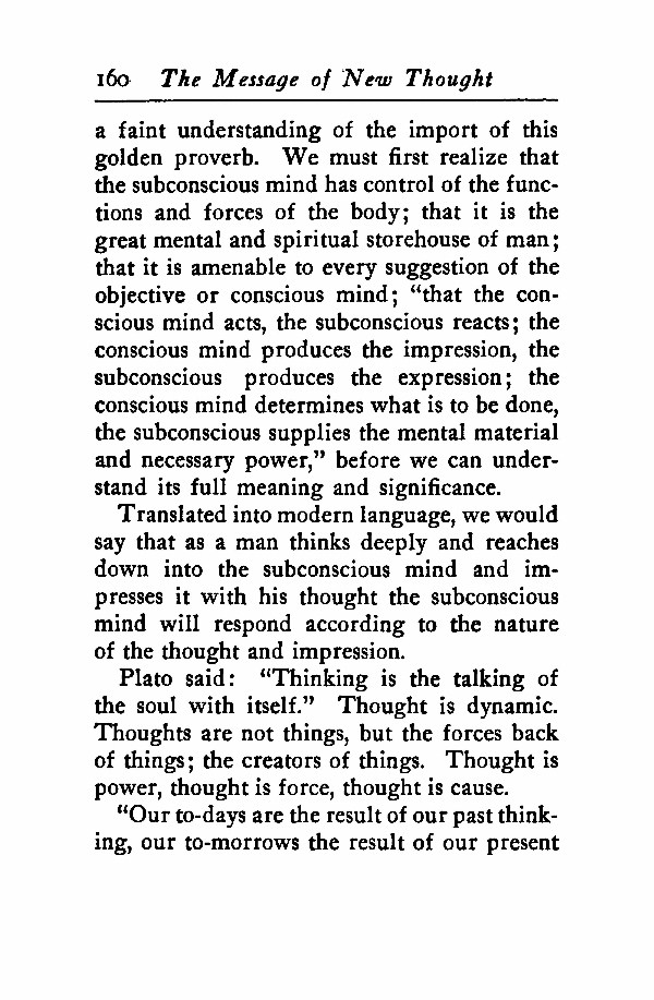 a faint understanding of the import of this golden proverb. We must first realize that the subconscious mind has control of the functions and forces of the body; that it is the great mental and spiritual storehouse of man; that it is amenable to every suggestion of the objective or conscious mind; "that the conscious mind acts, the subconscious reacts; the conscious mind produces the impression, the subconscious produces the expression; the conscious mind determines what is to be done, the subconscious supplies the mental material and necessary power," before we can understand its full meaning and significance.