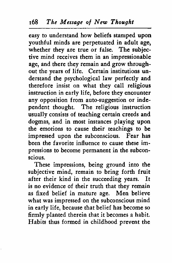 easy to understand how beliefs stamped upon youthful minds are perpetuated in adult age, whether they are true or false. The subjective mind receives them in an impressionable age, and there they remain and grow throughout the years of life. Certain institutions understand the psychological law perfectly and therefore insist on what they call religious instruction in early life, before they encounter any opposition from auto-suggestion or independent thought. The religious instruction usually consists of teaching certain creeds and dogmas, and in most instances playing upon the emotions to cause their teachings to be impressed upon the subconscious. Fear has been the favorite influence to cause these impressions to become permanent in the subconscious.