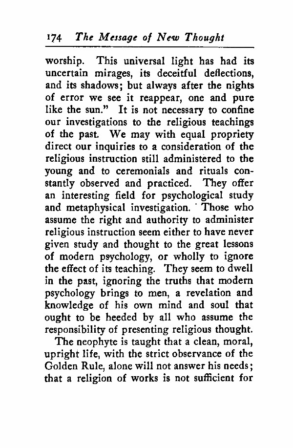 worship. This universal light has had its uncertain mirages, its deceitful deflections, and its shadows; but always after the nights of error we see it reappear, one and pure like the sun." It is not necessary to confine our investigations to the religious teachings of the past. We may with equal propriety direct our inquiries to a consideration of the religious instruction still administered to the young and to ceremonials and rituals constantly observed and practiced. They offer an interesting field for psychological study and metaphysical investigation. Those who assume the right and authority to administer religious instruction seem either to have never given study and thought to the great lessons of modern psychology, or wholly to ignore the effect of its teaching. They seem to dwell in the past, ignoring the truths that modern psychology brings to men, a revelation and knowledge of his own mind and soul that ought to be heeded by all who assume the responsibility of presenting religious thought.