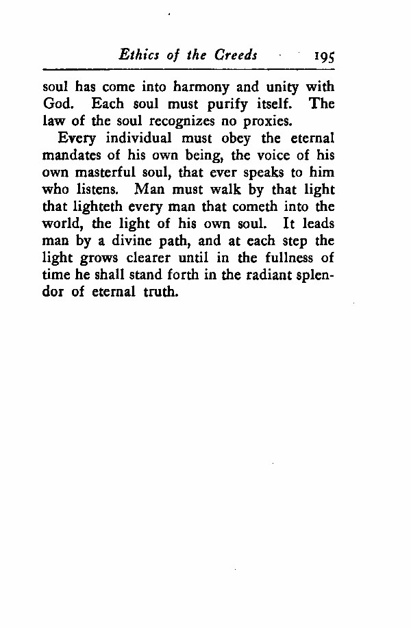 Every individual must obey the eternal mandates of his own being, the voice of his own masterful soul, that ever speaks to him who listens. Man must walk by that light that lighteth every man that cometh into the world, the light of his own soul. It leads man by a divine path, and at each step the light grows clearer until in the fullness of time he shall stand forth in the radiant splendor of eternal truth.