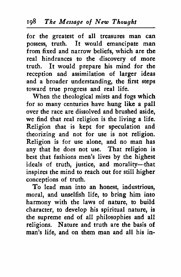 for the greatest of all treasures man can possess, truth. It would emancipate man from fixed and narrow beliefs, which are the real hindrances to the discovery of more truth. It would prepare his mind for the reception and assimilation of larger ideas and a broader understanding, the first steps toward true progress and real life.