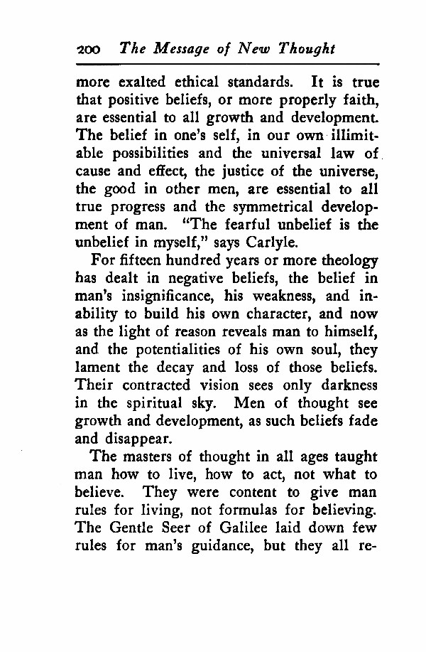 more exalted ethical standards. It is true that positive beliefs, or more properly faith, are essential to all growth and development. The belief in one's self, in our own illimitable possibilities and the universal law of cause and effect, the justice of the universe, the good in other men, are essential to all true progress and the symmetrical development of man. "The fearful unbelief is the unbelief in myself," says Carlyle.