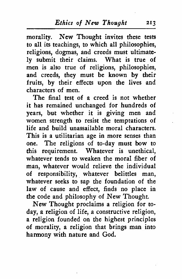 The final test of a creed is not whether it has remained unchanged for hundreds of years, but whether it is giving men and women strength to resist the temptations of life and build unassail- able moral characters. This is a utilitarian age in more senses than one. The religions of today must bow to this requirement. Whatever is unethical, whatever tends to weaken the moral fiber of man, whatever would relieve the individual of responsibility, whatever belittles man, whatever seeks to sap the foundation of the law of cause and effect, finds no place in the code and philosophy of New Thought.