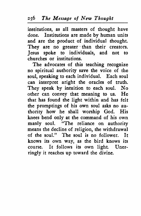 The advocates of this teaching recognize no spiritual authority save the voice of the soul, speaking to each individual. Each soul can interpret aright the oracles of truth. They speak by intuition to each soul. No other can convey that meaning to us. He that has found the light within and has felt the promptings of his own soul asks no authority how he shall worship God. His knees bend only at the command of his own manly soul, "The reliance on authority means the decline of religion, the withdrawal of the soul." The soul is no follower. It knows its own way, as the bird knows its course. It follows its own light. Unerringly it reaches up toward the divine.