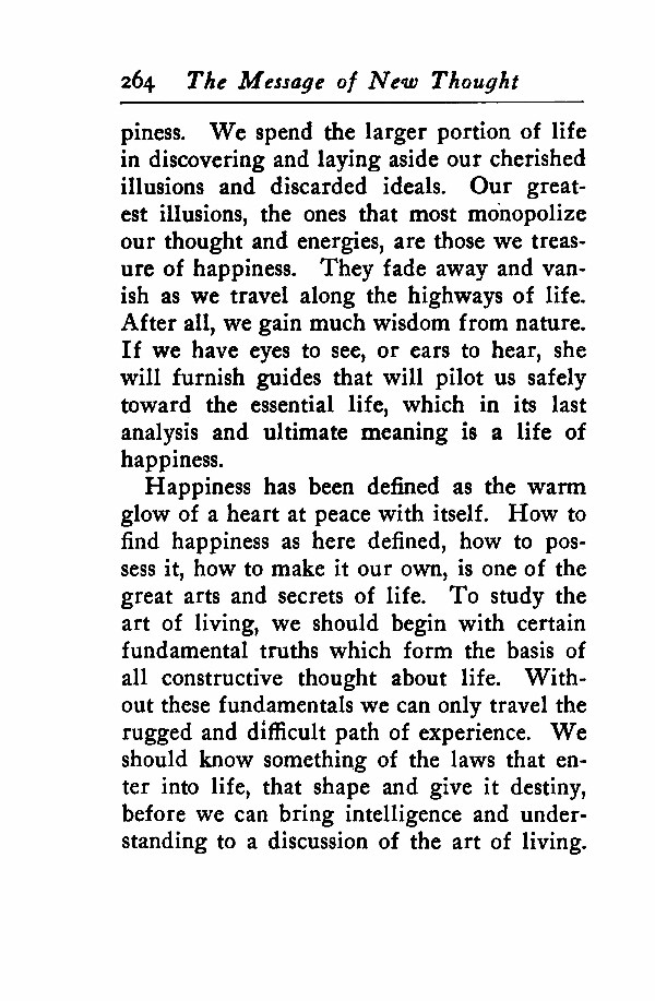 Happiness has been defined as the warm glow of a heart at peace with itself. How to find happiness as here defined, how to possess it, how to make it our own, is one of the great arts and secrets of life. To study the art of living, we should begin with certain fundamental truths which form the basis of all constructive thought about life. Without these fundamentals we can only travel the rugged and difficult path of experience. We should know something of the laws that enter into life, that shape and give it destiny, before we can bring intelligence and understanding to a discussion of the art of living.
