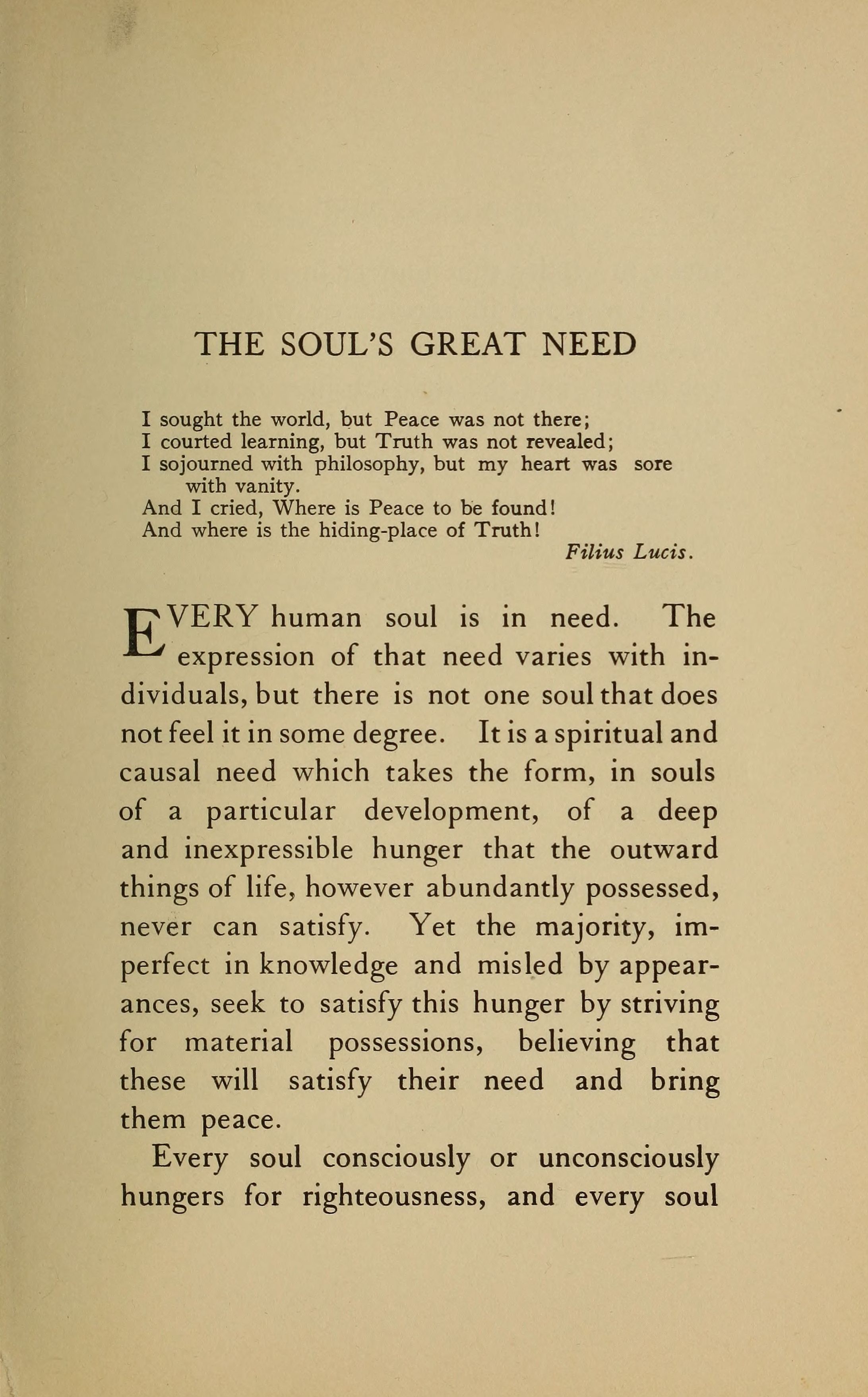 Contents - Preface - Foreword - The Soul’s Great Need - Competitive Laws and The Law of Love - Finding of a Principle - At Rest in The Kingdom and All Things Added - Divine Centre - Eternal Now - "Original Simplicity" - Unfailing Wisdom - Might of Meekness - Righteous Man - Perfect Love - Perfect Freedom - Greatness and Goodness - Heaven in the Heart -