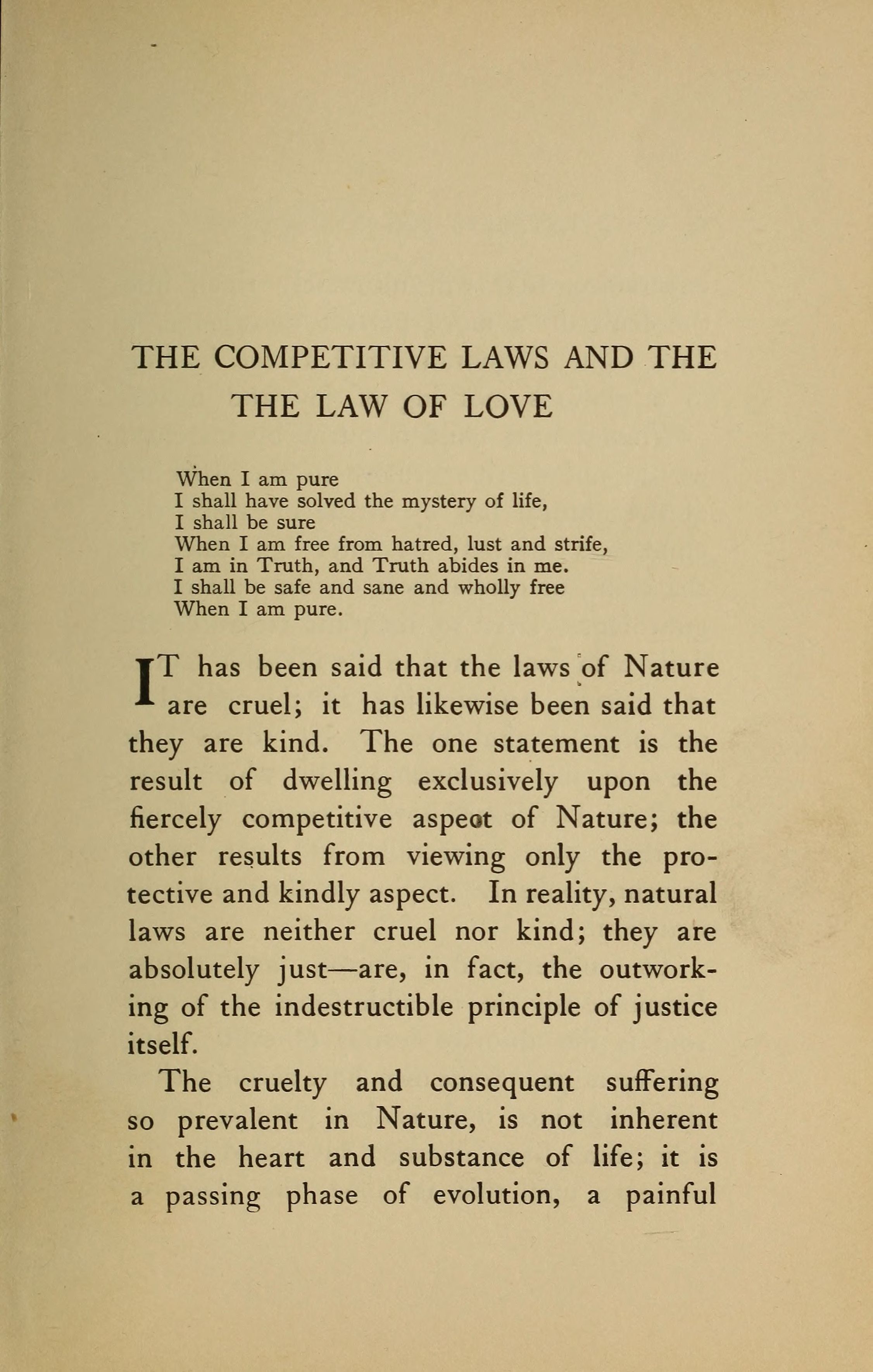 Wouldst thou preach the living word? Thou shalt forego thyself, and become that Word. Thou shalt know one thing—that the human heart is good, is divine; thou shalt live on one thing—Love. Thou shalt love all, seeing no evil, thinking no evil, believing no evil; then, though thou speak but little, thy every act shall be a power, thy every word a precept. By thy pure thought, thy selfless deed, though it appear hidden, thou shalt preach, down the ages, to untold multitudes of aspiring souls.