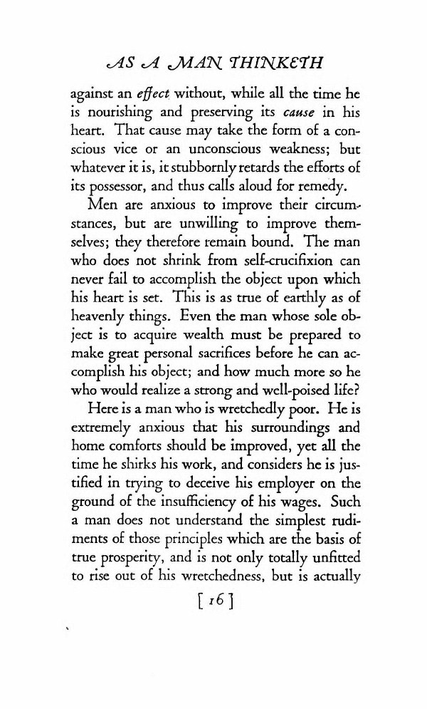 Men are anxious to improve their circumstances, but are unwilling to improve themselves. They therefore remain bound. The man who does not shrink from self-crucifixion can never fail to accomplish the object upon which his heart is set. This is as true of earthly as of heavenly things. Even the man whose sole object is to acquire wealth must be prepared to make great personal sacrifices before he can accomplish his object; and how much more so he who would realize a strong and well-poised life?