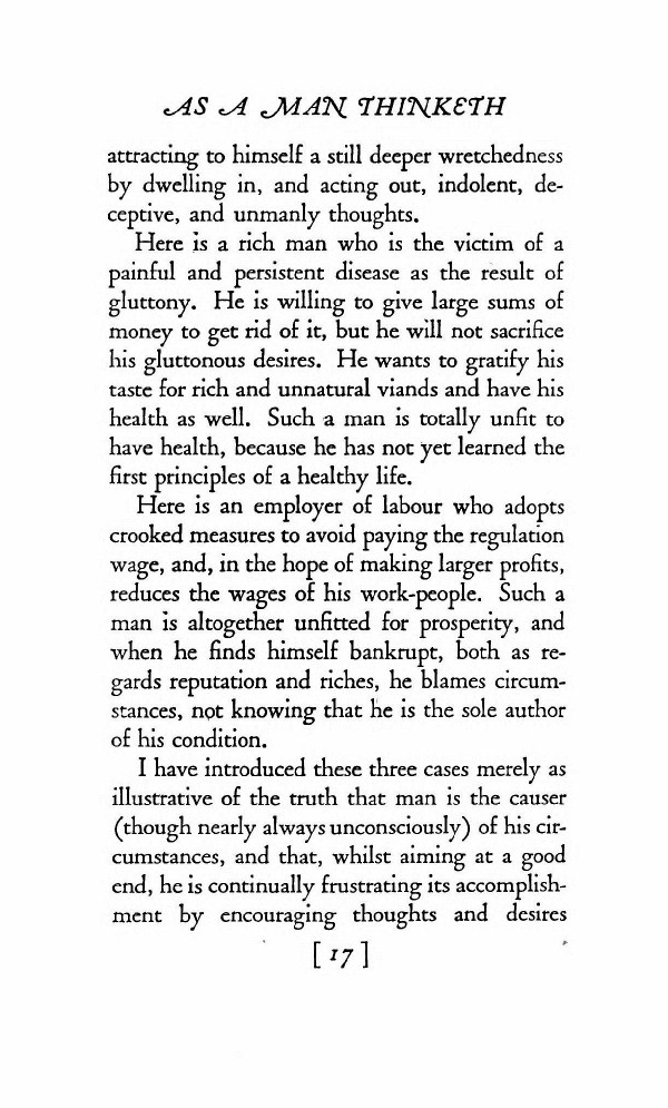 I have introduced these three cases merely as illustrative of the truth that man is the cause (though nearly always unconsciously) of his circumstance, and that, whilst aiming at a good end, he is continually frustrating its accomplishment by encouraging thoughts and desires