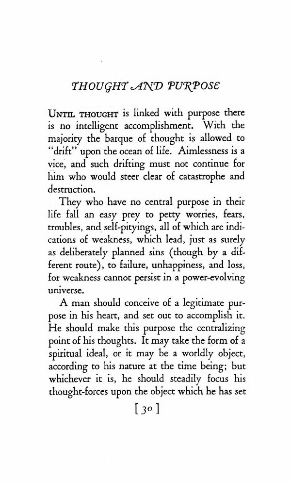 Until thought is linked with purpose there is no intelligent accomplishment. With the majority the bark of thought is allowed to "drift" upon the ocean of life. Aimlessness is a vice, and such drifting must not continue for him who would steer clear of catastrophe and destruction.