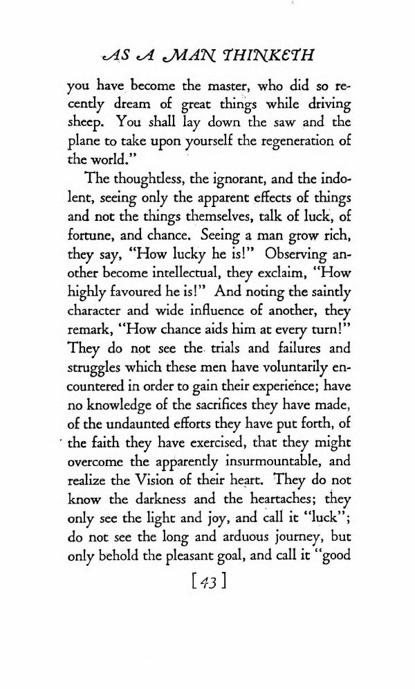 The thoughtless, the ignorant, and the indolent, seeing only the apparent effects of things and not the things themselves, talk of luck, of fortune, and chance. See a man grow rich, they say, "How lucky he is!" Observing another become intellectual, they exclaim, "How highly favoured he is!" And noting the saintly character and wide influence of another, the remark, "How chance aids him at every turn!"