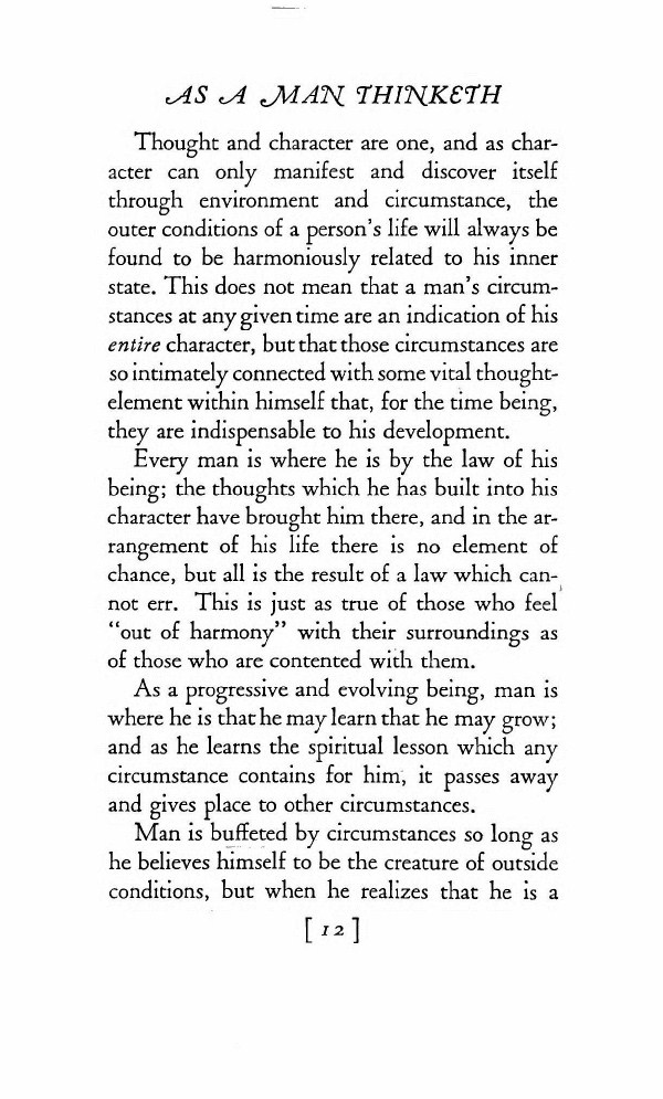 Thought and character are one, and as character can only manifest and discover itself through environment and circumstance, the outer conditions of a person's life will always be found to be harmoniously related to his inner state. This does not mean that a man's circumstances at any given time are an indication of his entire character, but that those circumstances are so intimately connected with some vital thought element within himself that, for the time being, they are indispensable to his development.