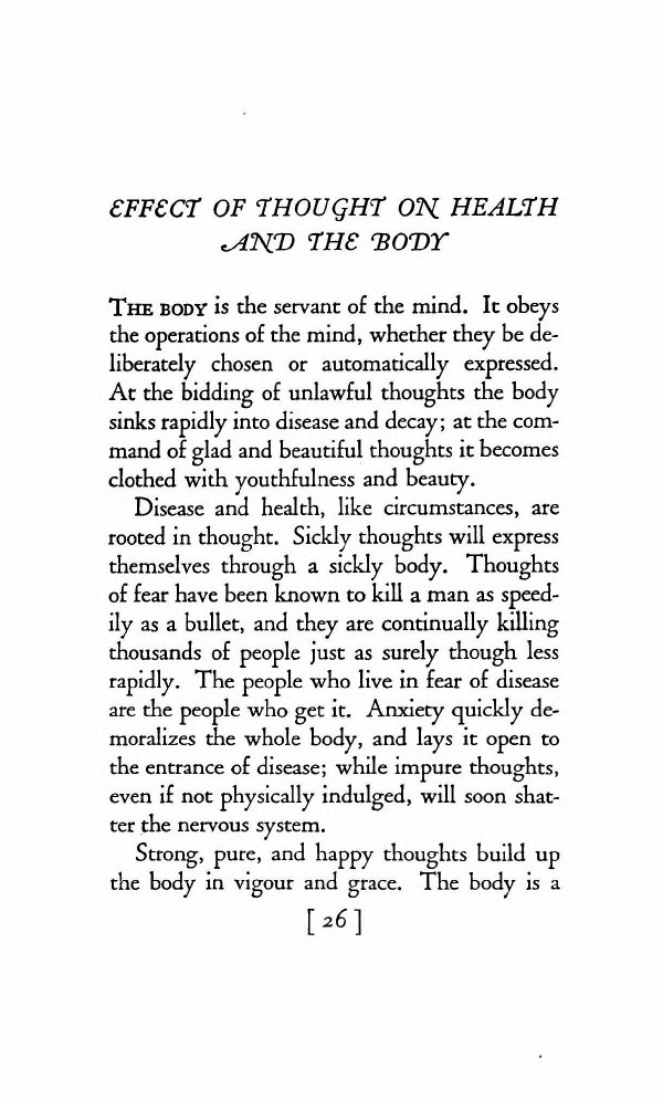 The body is the servant of the mind. It obeys the operations of the mind, whether they be deliberately chosen or automatically expressed. At the bidding of unlawful thoughts the body sinks rapidly into disease and decay; at the command of glad and beautiful thoughts it becomes clothed with youthfulness and beauty.