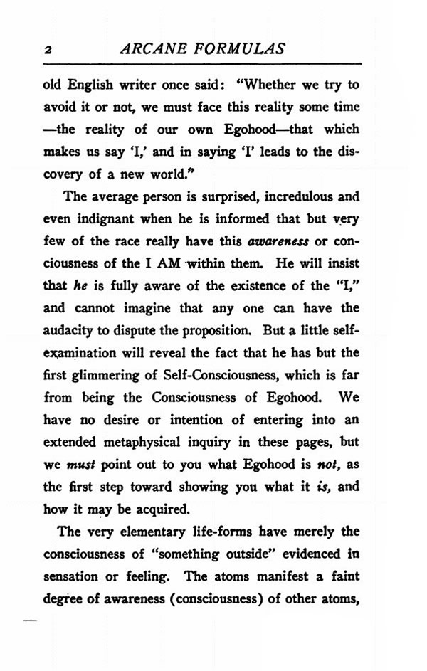 The average person is surprised, incredulous and even indignant when he is informed that but very few of the race really have this awareness or consciousness of the I AM within them. He will insist that he is fully aware of the existence of the "I," and cannot imagine that any one can have the audacity to dispute the proposition. But a little self examination will reveal the fact that he has but the first glimmering of Self-Consciousness, which is far from being the Consciousness of Egohood. We have no desire or intention of entering into an extended metaphysical inquiry in these pages, but we must point out to you what Egohood is not, as the first step toward showing you what it is, and how it may he acquired.