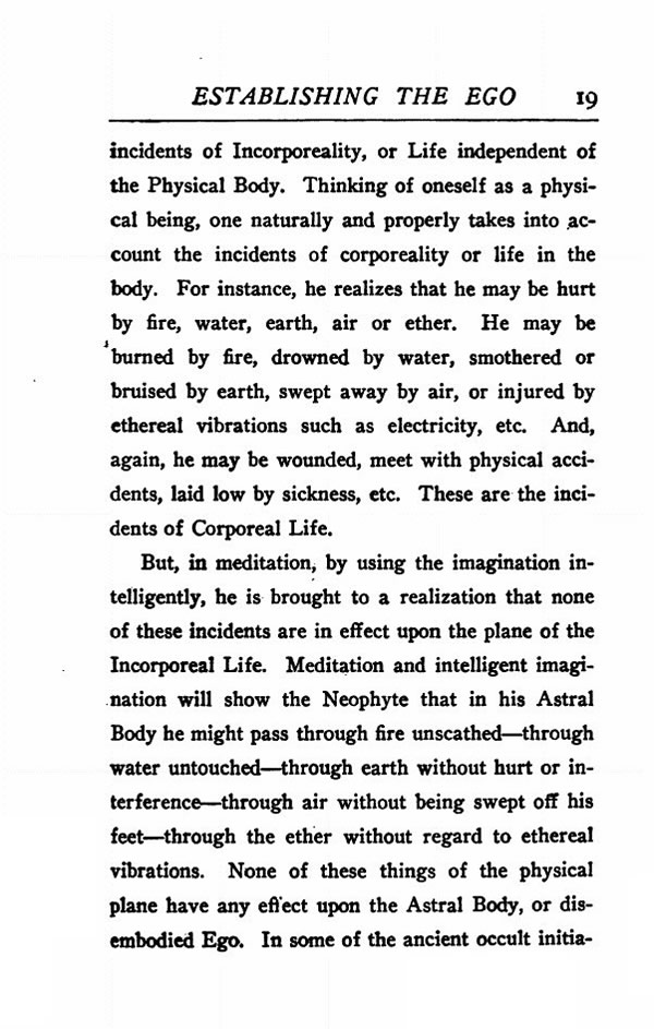 But, in meditation, by using the imagination intelligently, he is brought to a retaliation that none of these incidents are in effect upon the plane of the Incorporeal Life. Meditation and intelligent imagination will show the Neophyte that in his Astral Body he might pass through her unscathed --- through water untouched --- through earth without hurt or interference --- through air without being swept off his feet --- through the ether without regard to ethereal vibrations. None of these things of the physical plane have any effect upon the Astral Body, or disembodied Ego. In some of the ancient occult initiatory