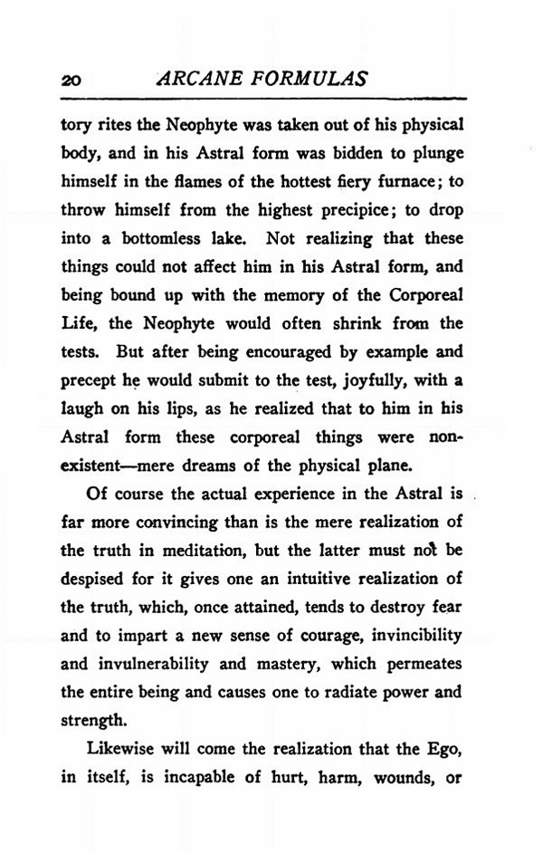 rites the Neophyte was taken out of his physical body, and in his Astral form was bidden to plunge himself in the flames of the hottest fiery furnace; to throw himself from the highest precipice; to drop into a bottomless lake. Not realizing that these things could not affect him in his Astral form, and being bound up with the memory of the Corporeal Life, the Neophyte would often shrink from the tests. But after being encouraged by example and precept he would submit to the test, joyfully, with a laugh on his lips, as he realized that to him in his Astral form these corporeal things were nonexistent --- mere dreams of the physical plane.