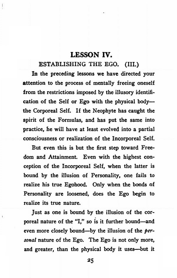 In the preceding lessons we have directed your attention to the process of mentally freeing oneself from the restrictions imposed by the illusory identification of the Self or Ego with the physical body --- the Corporeal Self. If the Neophyte has caught the spirit of the Formulas, and has put the same into practice, he will have at least evolved into a partial consciousness or realization of the Incorporeal Self.