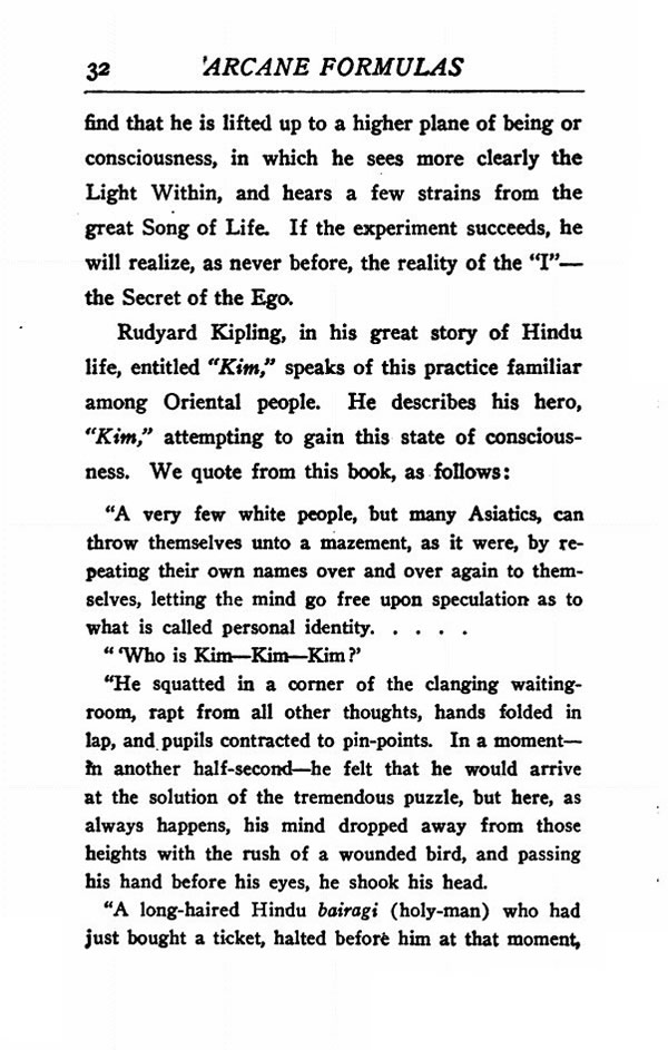 Rudyard Kipling, in his great story of Hindu life, entitled "Kim," speaks of this practice familiar among Oriental people. He describes his hero, "Kim," attempting to gain this state of consciousness. We quote from this book, as follows: