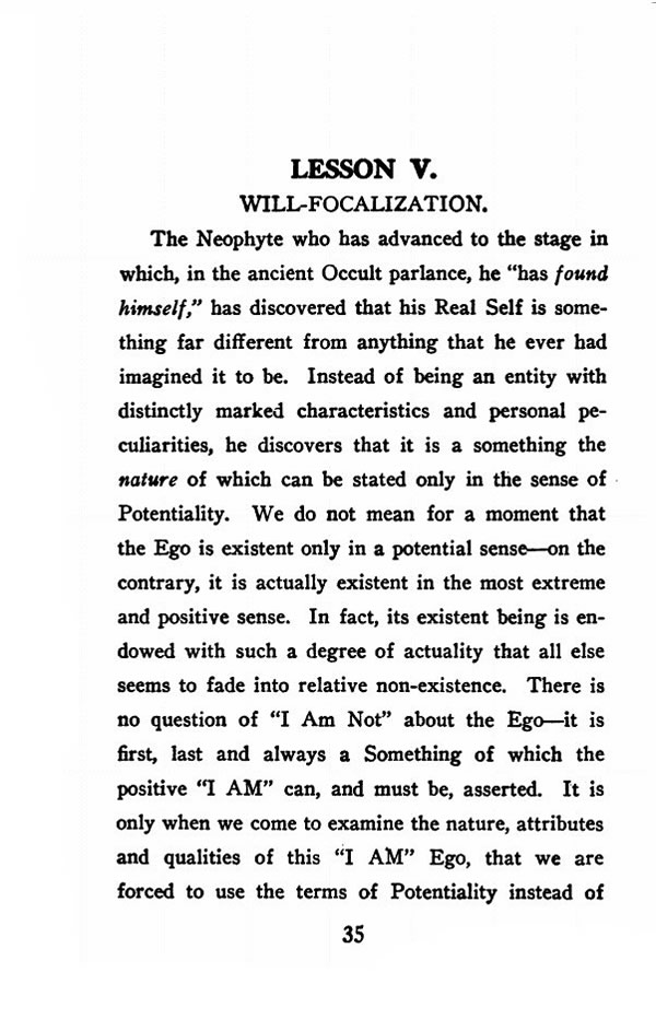 The Neophyte who has advanced to the stage in which, in the ancient Occult parlance, he "has found himself," has discovered that his Real Self is something far different from anything that he ever had imagined it to be. Instead of being an entity with distinctly marked characteristics and personal peculiarities, he discovers that it is a something the nature of which can be stated only in the sense of Potentiality. We do not mean for a moment that the Ego is existent only in a potential sense --- on the contrary, it is actually existent in the most extreme and positive sense. In fact, its existent being is endowed with such a degree of actuality that all else seems to fade into relative non-existence. There is no question of "I Am Not" about the Ego --- it is first, last and always a Something of which the positive AM" can, and must be, asserted. It is only when we come to examine the nature, attributes and qualities of this "I AM" Ego, that we are forced to use the terms of Potentiality instead of
