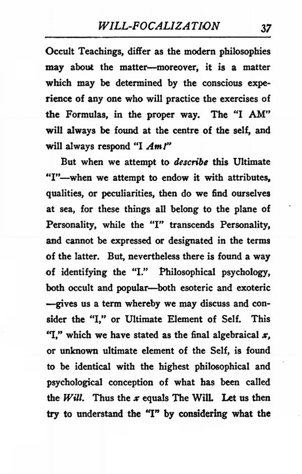 But when we attempt to describe this Ultimate "I" --- when we attempt to endow it with attributes, qualities, or peculiarities, then do we find ourselves at sea, for these things all belong to the plane of Personality, while the "I" transcends Personality, and cannot be expressed or designated in the terms of the latter. But, nevertheless there is found a way of identifying the "I." Philosophical psychology, both occult and popular --- both esoteric and exoteric --- gives us a term whereby we may discuss and consider the "I," or Ultimate Element of Self. This "I," which we have stated as the final algebraical x, or unknown ultimate element of the Self, is found to be identical with the highest philosophical and psychological conception of what has been called the Will. Thus the x equals The Will. Let us then try to understand the "I" by considering what the