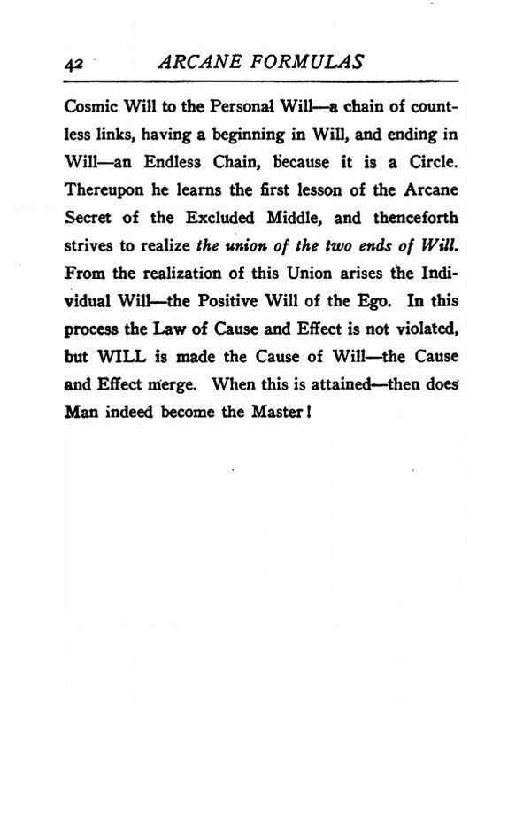 Egohood - Establishing the Ego - 1 - Establishing the Ego - 2 - Establishing the Ego - 3 - Will Focalization - The Excluded Middle - Mastering the Opposite - Neutralizing Rhythm - Cyclicity and Balance - Mentalism in a Nutshell - Formula for Positivity - Will Atmosphere - Personal Positivity - Visualization - Statements - Denials - Mental Alchemy - Mental Vibration - Thought Waves and Currents - Thought Forms - Practical Methods - Concentration - Mental Imaging - Materialization of Thought - Aids to Mental Imaging - General Application - The Arcane Formula - Contents -