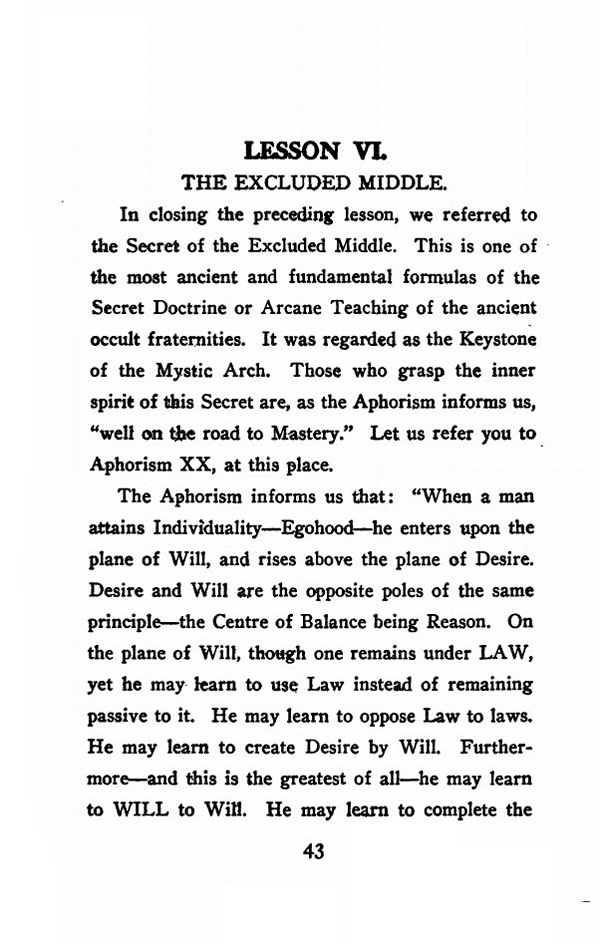 In closing the preceding lesson, we referred to the Secret of the Excluded Middle. This is one of the most ancient and fundamental formulas of the Secret Doctrine or Arcane Teaching of the ancient occult fraternities. It was regarded as the Keystone of the Mystic Arch. Those who grasp the inner spirit of this Secret are, as the Aphorism informs us, well on the road to Mastery." Let us refer you to Aphorism XX, at this place.