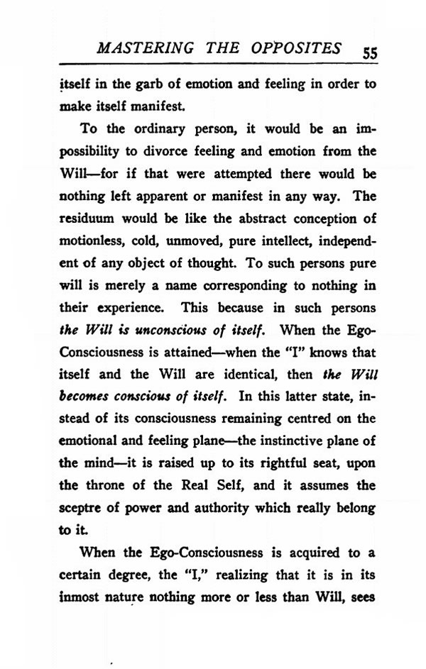 To the ordinary person, it would be an impossibility to divorce feeling and emotion from the Will --- for if that were attempted there would be nothing left apparent or manifest in any way. The residuum would be like the abstract conception of motionless, cold, unmoved, pure intellect, independent of any object of thought. To such persons pure will is merely a name corresponding to nothing in their experience. This because in such persons the Will is unconscious of itself. When the Ego Consciousness is attained --- when the "I" knows that itself and the Will are identical, then the Will becomes conscious of itself. In this latter state, instead of its consciousness remaining centered on the emotional and feeling plane --- the instinctive plane of the mind --- it is raised up to its rightful seat, upon the throne of the Real Self, and it assumes the scepter of power and authority which really belong to it.
