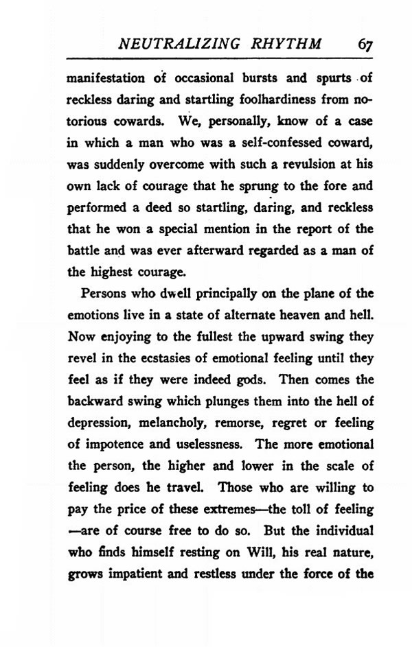 Persons who dwell principally on the plane of the emotions live in a state of alternate heaven and hell. Now enjoying to the fullest the upward swing they revel in the ecstasies of emotional feeling until they feel as if they were indeed gods. Then comes the backward swing which plunges them into the hell of depression, melancholy, remorse, regret or feeling of impotence and uselessness. The more emotional the person, the higher and lower in the scale of feeling does he travel. Those who are willing to pay the price of these extremes --- the toll of feeling --- are of course free to do so. But the individual who finds himself resting on Will, his real nature, grows impatient and restless under the force of the
